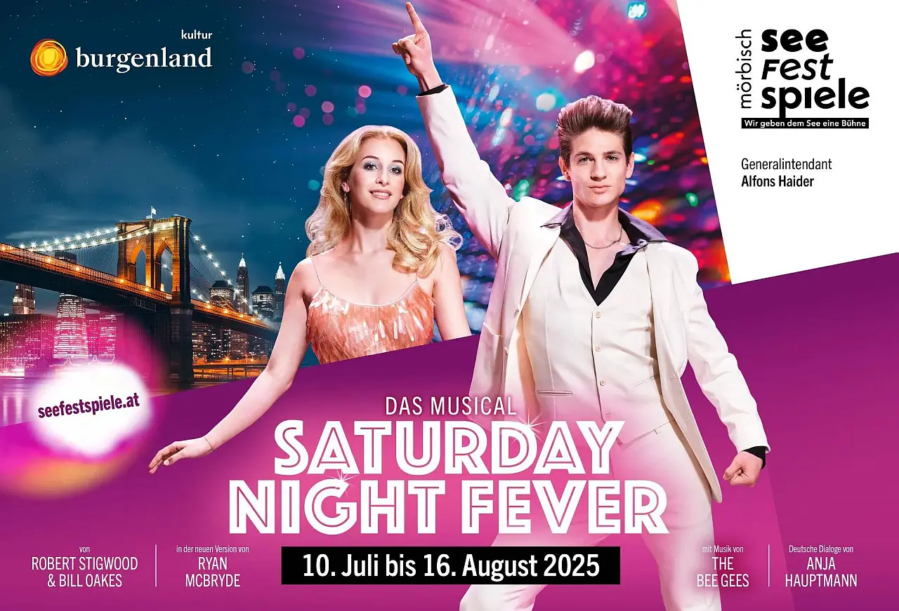 Mit dem Musical-Hit von Robert Stigwood & Bill Oakes und der Erfolgs-Musik der Bee Gees ist wieder Discofieber auf der Seebühne Mörbisch angesagt. Der Kinofilm löste Ende der 70er eine weltweite Discowelle aus und machte John Travolta in der Rolle des Tony Manero zum Star.